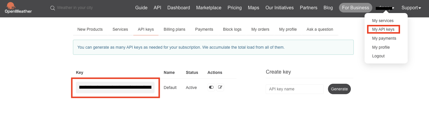 홈페이지 우측 위에 본인의 닉네임을 클릭하고 My API keys 를 누르면 API key 를 확인할 수 있다.